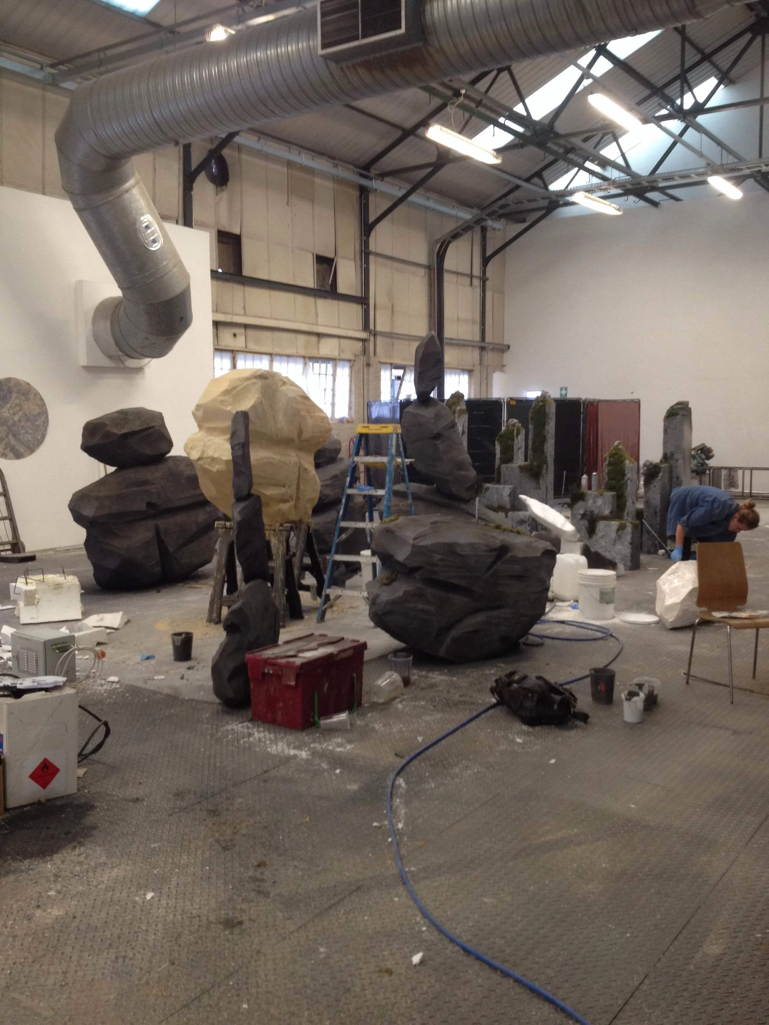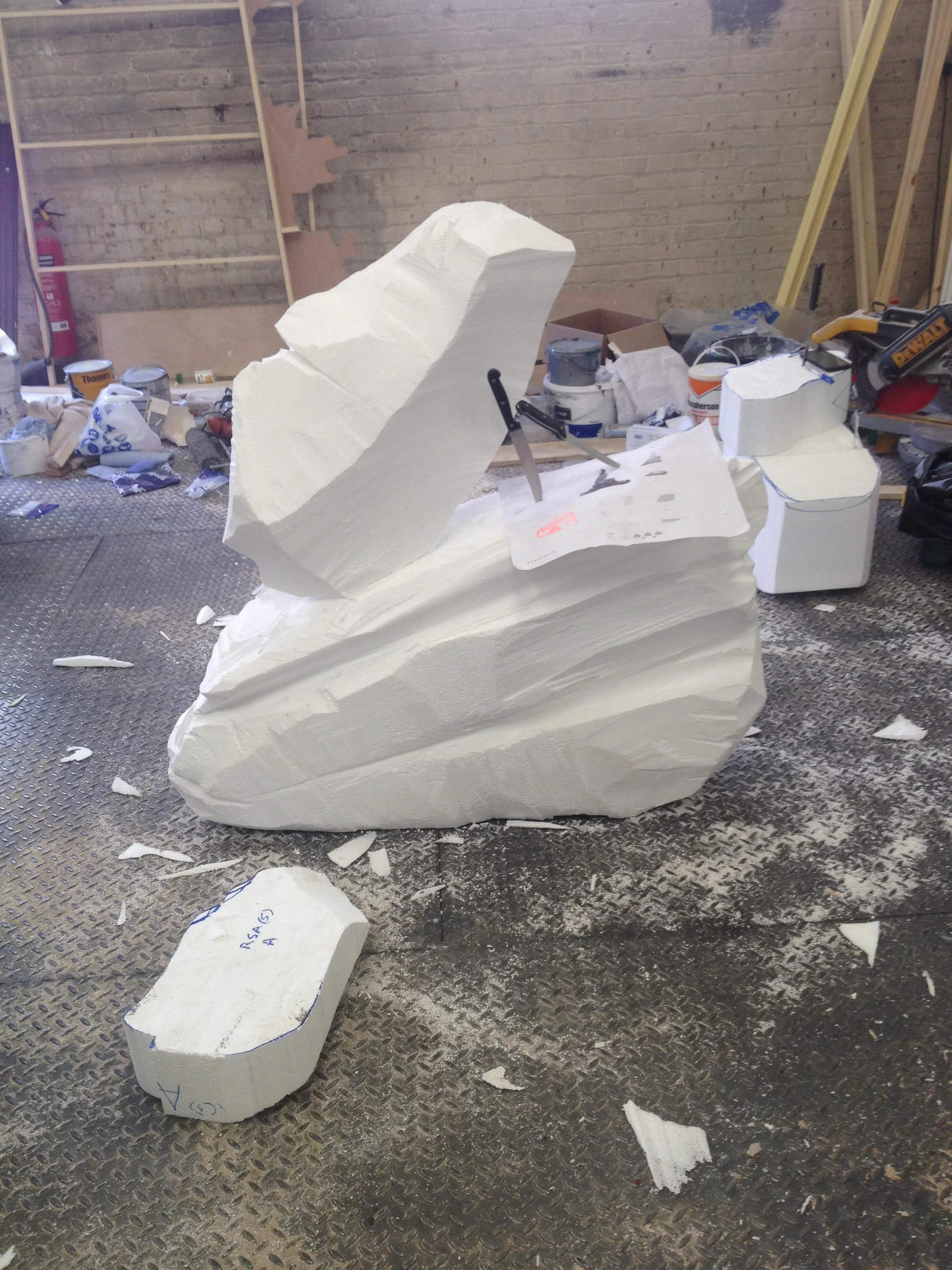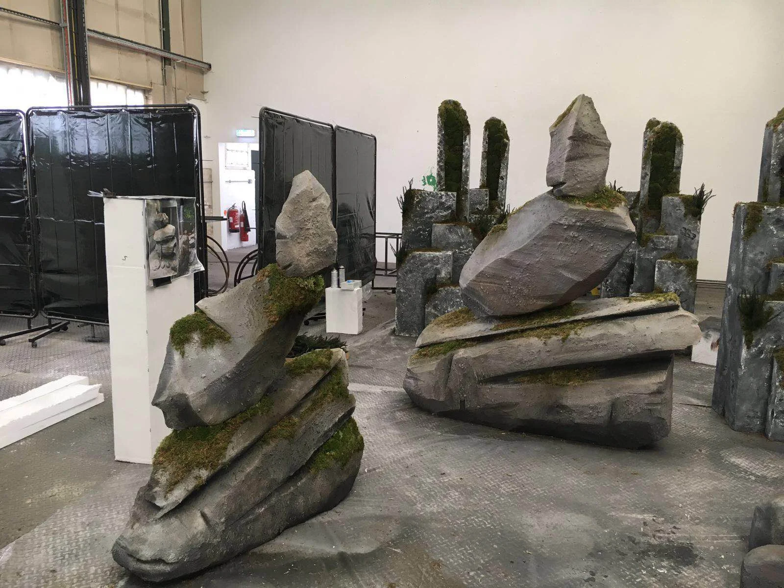 Using a hot wire and surform the rocks were sculpted down to size and stacked together until I was happy with the look, they were then given a few layers of Jesmonite mixed with gravel and sand for strength and texture before being painted and adding moss.