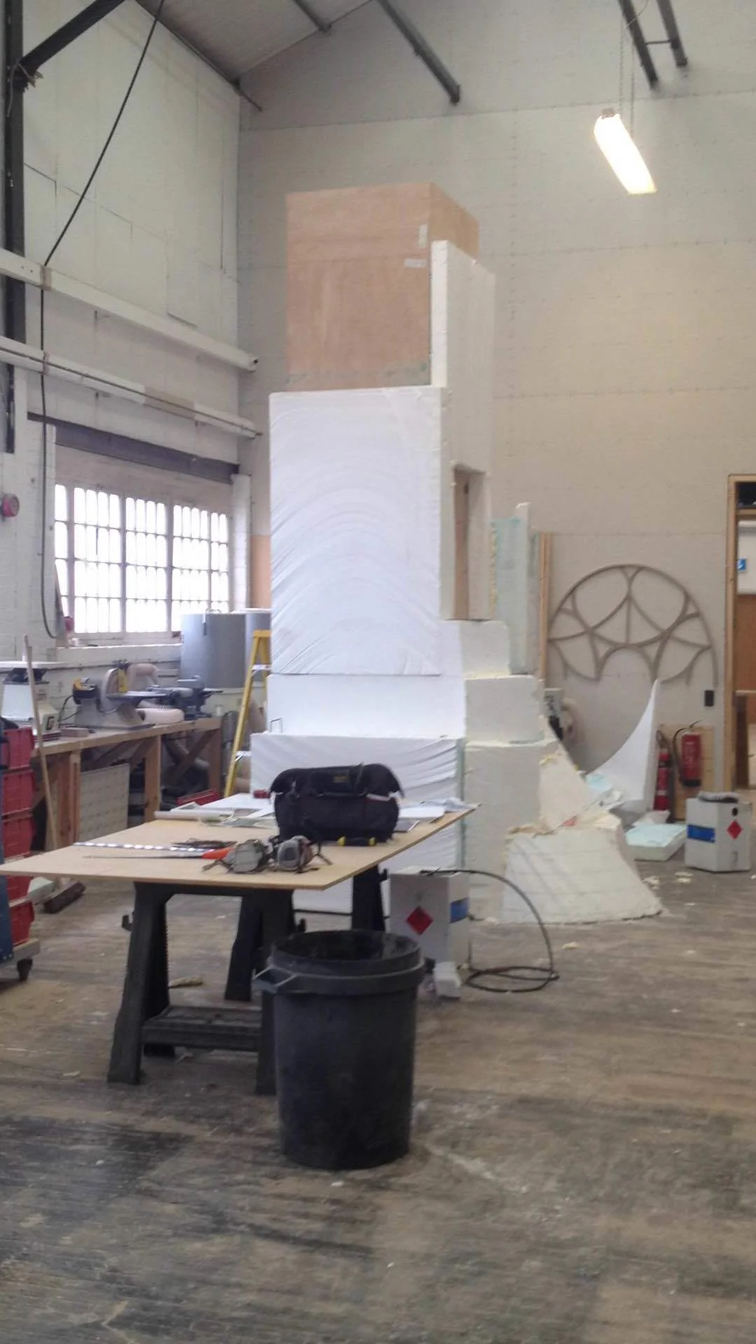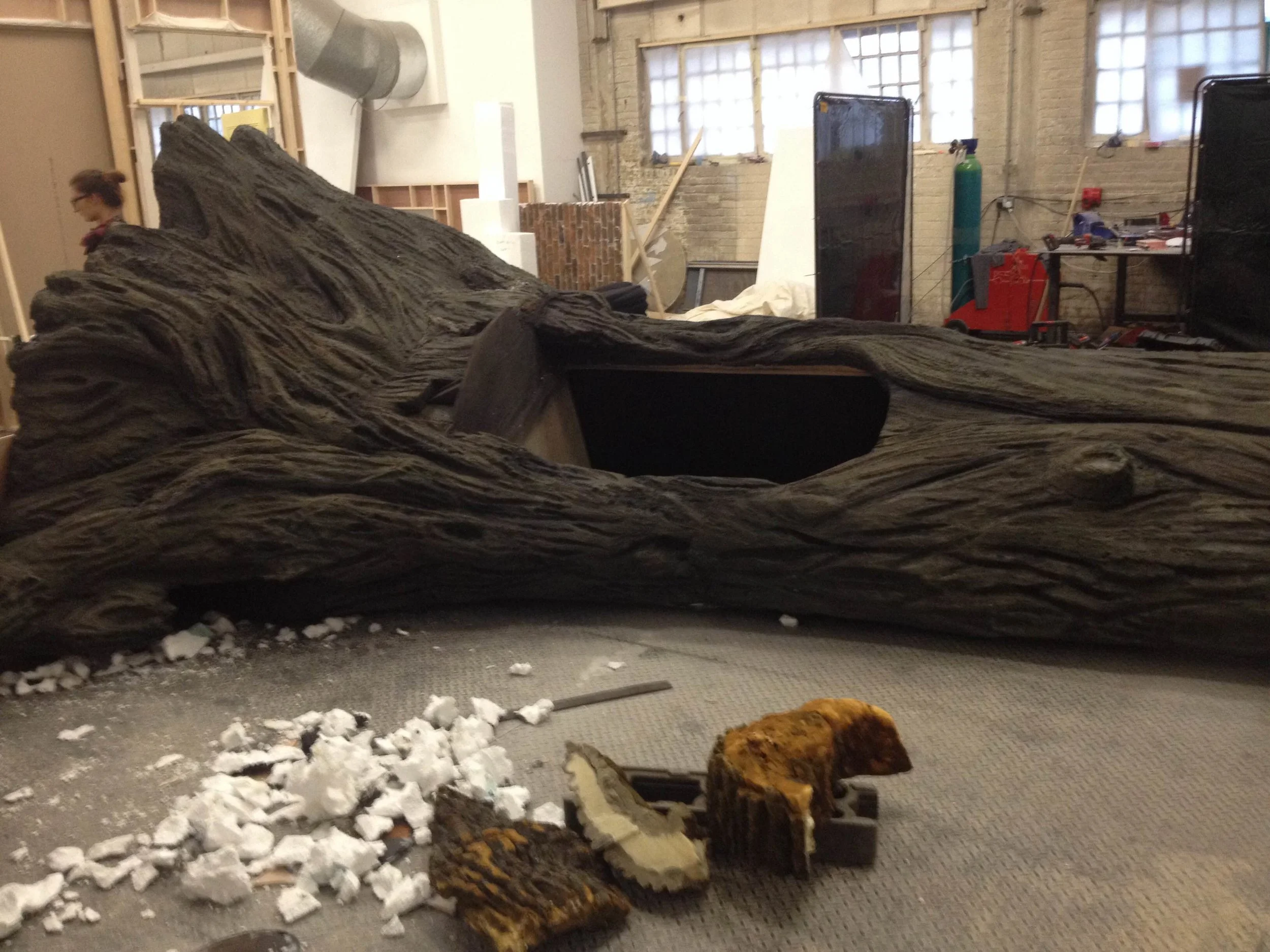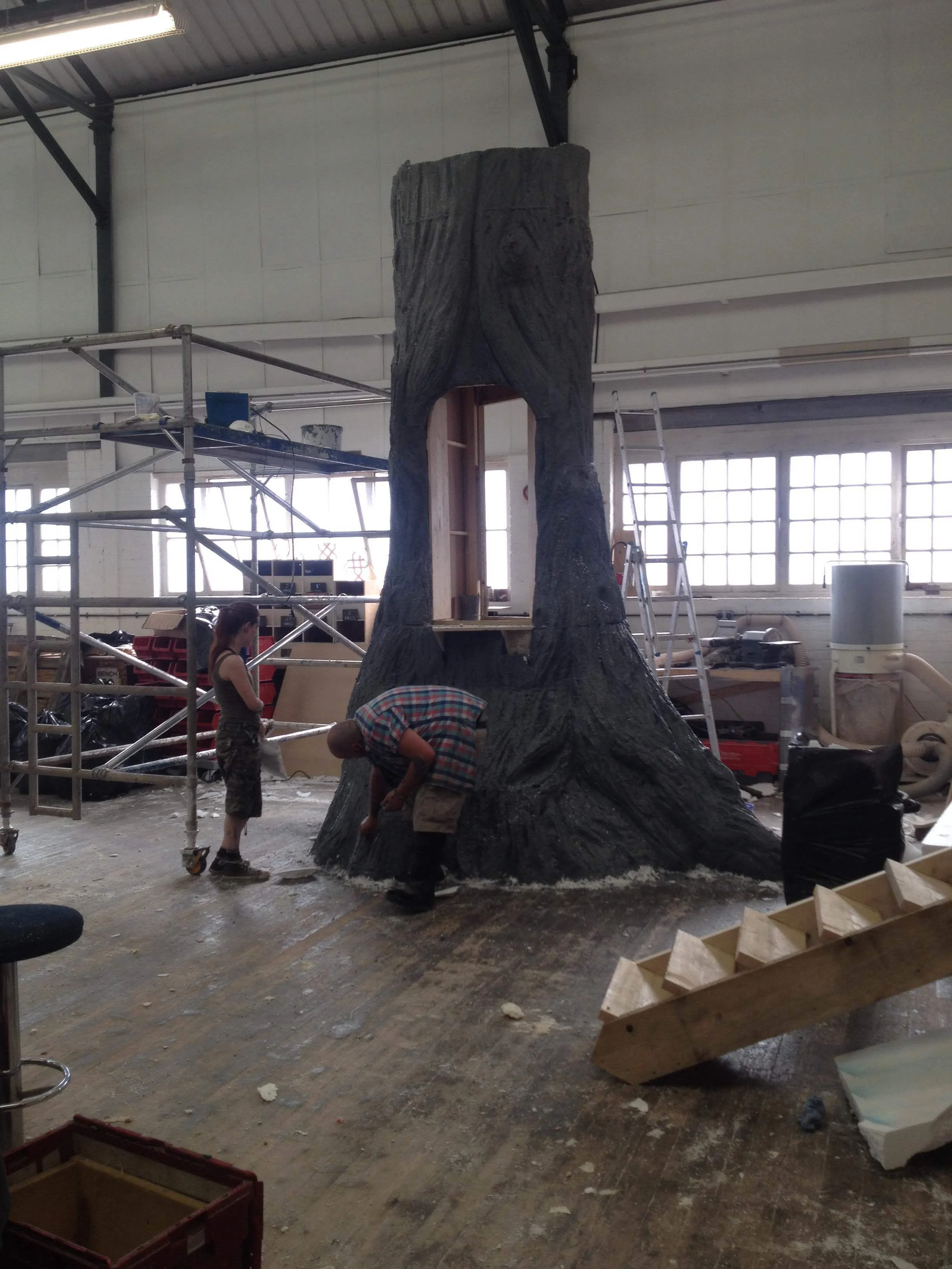 This was a stage/television production that required us make a huge tree with door and steps, using a wooden frame we clad the structure with off cuts of polystyrene and contact adhesive before sculpting the tree. The whole structure was then covered in a thick Idenden coat and painted.